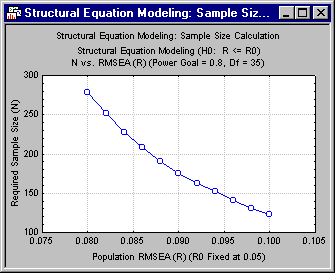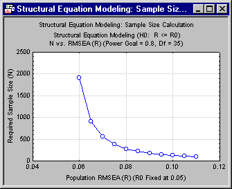 Statistica makes it very easy to conduct this sensitivity analysis. First, we examine required N as a function of the RMSEA value. The default values of the X-Axis Graphing Parameters on the Structural Equation Modeling: Sample Size Calc. Results - Quick tab will analyze the effect of the value of RMSEA from .06 to .11 (see the Start R and End R boxes). Click the N vs. R button to examine the relationship.