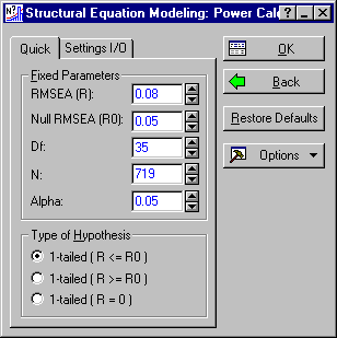 Consequently, a compromise decision would be to use the sample size for m = 4, i.e., 719. This sample size can be expected to generate outstanding power for m = 1,2,3 and power of .80 for m=4. This can be verified by returning to the Startup Panel (by clicking the Back button on both the Structural Equation Modeling: Sample Size Calc. Results and the Structural Equation Modeling: Sample Size Parameters dialog boxes), and selecting Power Calculation and Structural Equation Modeling.