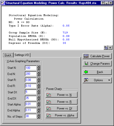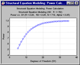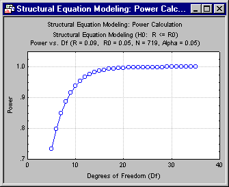 You can see that this compromise leaves the power at only .51 for the m=5 test, although the power is more than adequate for all the other tests. However, the situation is not quite as bad as it seems, because if the actual RMSEA is .09 instead of .08, the power for the m = 5 test rises rather dramatically to .73. Thus, click the Back button on the Structural Equation Modeling: Power Calc. Results dialog to return to the Structural Equation Modeling: Power Calculation Parameters - Quick tab and enter 0.09 in the RMSEA (R) box. Then click the OK button to return to the Results dialog box and click the Power vs. Df button.