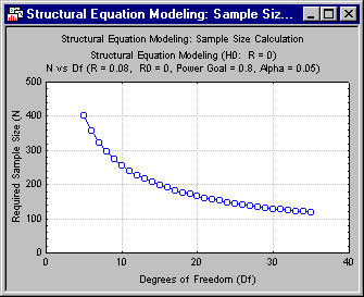 Click the N vs. Df button to generate a plot of required N for degrees of freedom from 5 to 35.