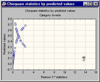 You can plot the Pearson Chi-square values (contributions to Chi-square) for each case against the predicted values for each (non-reference) category. To produce this plot, select the Resid. 2 tab, and then click the Pred. & Diff. X2 (Chi-square) button. You can see the plot for category Invertebrates.