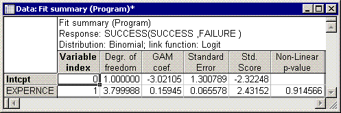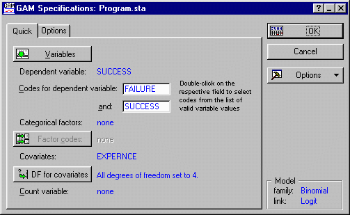 Click OK, to display the GAM Specifications dialog, and click the Variables button to display a standard variable selection dialog. Select the variables for the analysis: Select Success as the dependent variable, and Expernce as the continuous predictor variable (in the third list of the 4-variable lists selection dialog). Click the OK button.