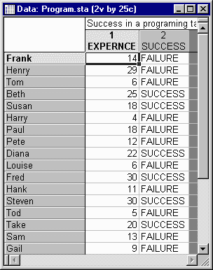 Suppose you want to study whether experience helps programmers complete complex programming tasks within a specified amount of time. Twenty-five programmers are selected with different degrees of experience (measured in months). They are then asked to complete a complex programming task within a certain amount of time. The binary dependent variable is the programmers' success or failure in completing the task. These data are recorded in the file Program.sta; shown below is a partial listing of this file.