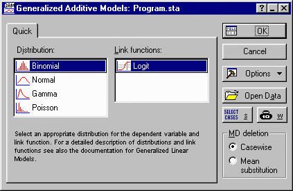 As you can see, a number of results spreadsheets and graphs are reported to provide a comprehensive picture of the quality of the fit of the model and to aid in the interpretation of results. The interpretation of results from fitting generalized additive models is complex and requires experience (note that these techniques were only developed fairly recently, and there is not a large body of literature and "experience" with these techniques); Hastie and Tibshirani provide detailed discussions on how to interpret the results from these types of analyses, and more importantly, how to use this information to evaluate the appropriateness of the solutions obtained. You can also refer to Schimek (2000) for more recent developments regarding these techniques, and their applications.