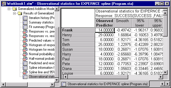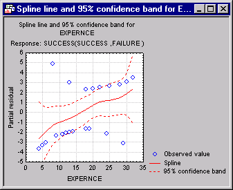 To reiterate, this plot shows the final fitted cubic spline function, along with the observed predictor values, plotted against the partial residuals, i.e., against the residual values for the prediction of the (adjusted) dependent variable, after removing all other effects from the model (see Hastie & Tibshirani, 1990 for computational details; in particular formula 6.3 for the computation of adjusted dependent variable values). In this case, of course, there is only a single effect in the model. As you can see, the greater the experience of a programmer, the more likely is his or her success, as indicated by the monotone increasing cubic spline line.