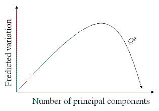 The quantity used to find the optimal complexity of a PC model is the predicted variation Q2. As we add more and more components to the PC model, Q2 increases. However, this trend gives way to a decrease in Q2 if we add more components beyond a certain point. The point of inflation in the value of Q2 provides an estimate of C.