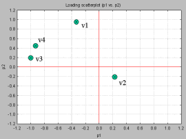 The fact that variables v3 and v4 are close (in the upper left section) means that they influence the PCA model in similar ways. It also means that they are positively correlated. v2 also contributes to the PCA model in ways similar to those of v3 and v4. The further a variable is away from the origin, the more influential that variable is. This means that v2 is less influential compared to the rest. This variable is also negatively correlated to v1, v3, and v4 (since it is positioned diagonally opposite of the upper-left quadrant where v3 and v4 is). This simply means that v2 contributes to the PCA model in ways different from v1, v3, and v4.