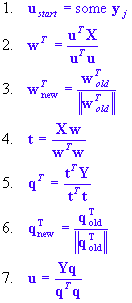The algorithm extracts one principal component at a time. Each component is calculated from the iterative regression of X onto the x-scores t, such that at each iteration a better loading factor p is found. The value of p is then used to improve the estimate of t.