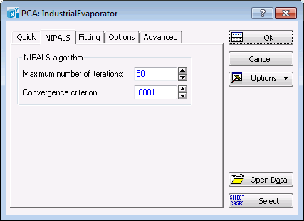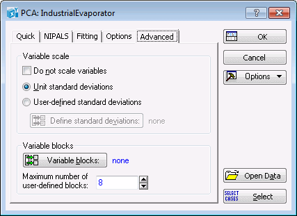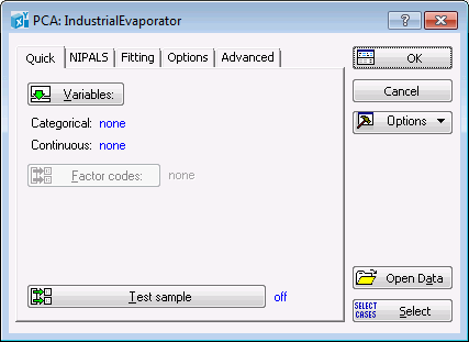At this point you may want to check the analysis configuration, which is determined by the option settings on the Quick, NIPALS, Fitting, Options, and Advanced tabs. These tabs provide various options that may need to be reconfigured to suit your individual analysis.