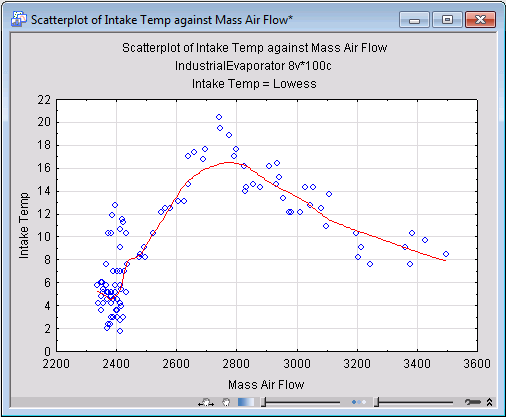 Study of this graph shows a noticeable amount of clustering among the variables. Variables placed close to each other influence the PCA model in similar ways, which also indicates they are correlated. Mass Air Flow and Intake Temp are examples of such variables with a substantial degree of correlation. In fact, the scatterplot of these two variables (which you can generate by clicking Scatterplot on the Statistica Graphs tab) show a nonlinear trend between the two.