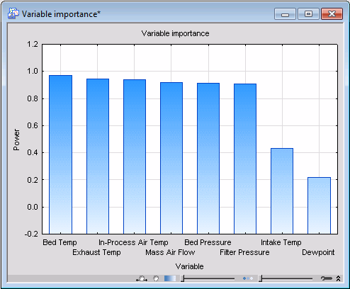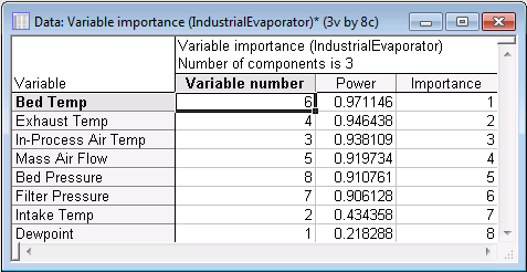An examination of the plot shows that variable In-Process Air Temp is the least influential in determining the first principal component while Bed Temp plays the most significant important role. This conclusion is confirmed by the spreadsheet and histogram plots of the variables' importance (Variable importance button on the