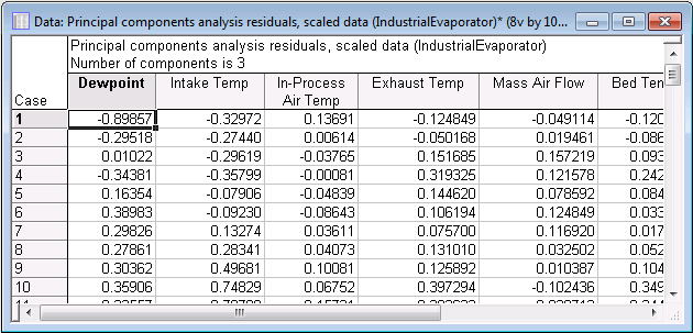 Further casewise data diagnostics can be carried out using the scatterplot of the x-scores. The x-scores are the transformed values of the X observations in the principal component system. An x-score with too high a value (i.e., one that deviates substantially from the point of origin) can again be regarded as an outlier or abnormal. To generate an x-scores scatterplot, select the