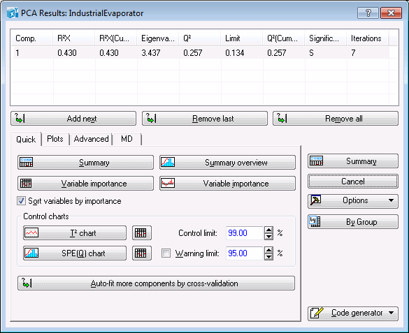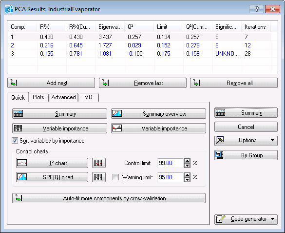 Again, remove all the extracted components, and then click the Auto-fit more components by cross-validation button. This will recreate the initial PCA model that was built by clicking the OK button in the PCA dialog box. In other words, it will take you back to that stage of the analysis before you manually removed and added components from and to the model.