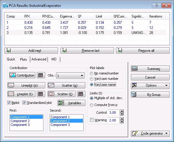 The Summary box is located at the top of the PCA Results dialog box and contains information about the PC model such as R2X, Eigenvalues, Q2, Limit, Significance, and number of Iterations for each component. The same information can be displayed in a spreadsheet by clicking the Summary button.