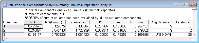 In this particular example, we used the cross-validation method for determining the optimal number of principal components (i.e., model complexity), which happens to be 3 in this case. This means that, on this occasion, the cross-validation algorithm found a PC model with 3 components to best represent the data set. See PCA and PLS Technical Notes for more details on cross-validation.