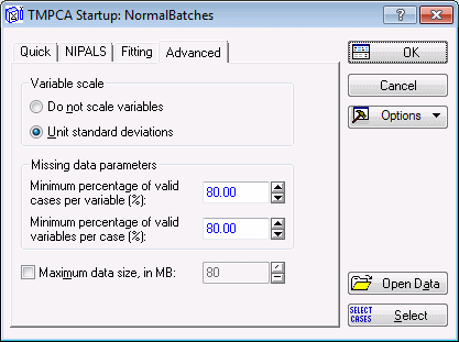 An important feature of Statistica TMPCA is its preprocessing functionality, which enables you to scale data for better model building. The default is Unit standard deviations (this option is located on the Advanced tab). It is generally recommended that you scale your variables to unit variance (for more details on variable scaling, see PCA and PLS Technical Details).