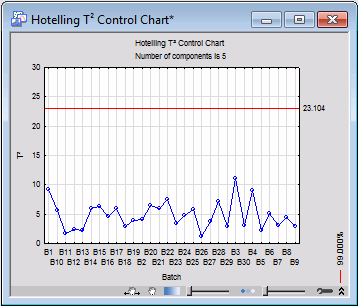 One important chart to review is the so-called Hotelling T2, which you can use to detect moderate (by comparison) outliers (i.e., abnormal batches). Produce this chart by clicking the T2 chart button on the Results dialog box - Quick tab.