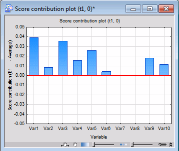 Another useful graph you can produce is the variable contributions to the scores of a principal component for a specific batch and time slot. Click the Contribution button with the graph icon: