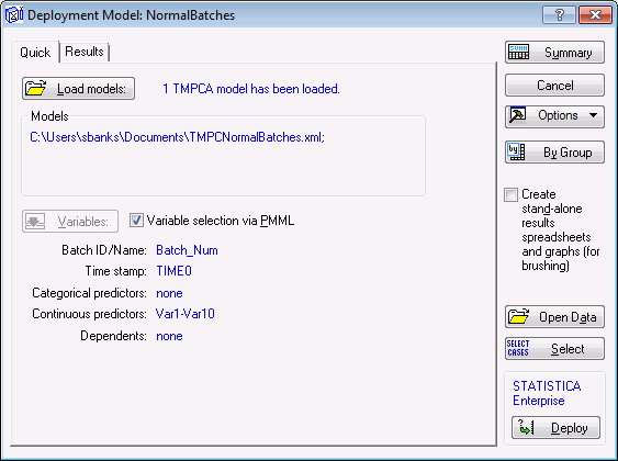 Click the Load models button on the Deployment Model dialog box - Quick tab. The Open PMML files dialog box will be displayed. Browse to the location where the TMPCANormalBatches.xml file was saved, select it, and click the Open button.