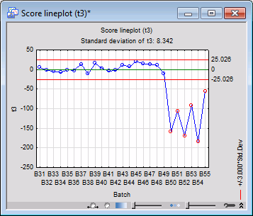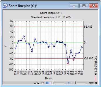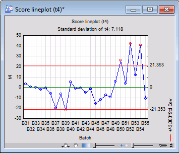 Further batch diagnostics can be carried out using the scatterplot of the t-scores. The t-scores are the transformed values of the process variables in the principal component system. A t-score with too high a value (i.e., one that deviates substantially from the point of origin) can be regarded as a sign of abnormality.