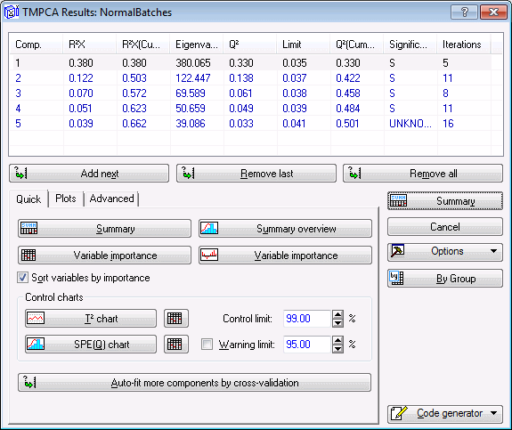 The settings discussed above will determine not only the results, but also the quality of your model, i.e., its ability to predict unseen examples and detect important features that might be present in the data, such as outliers. In the context of batch processing, outliers can be an indication of abnormal batches. Detecting such batches is one of the primary goals of process monitoring in quality control. Note that each analysis is unique, and care should be taken in configuring its settings.