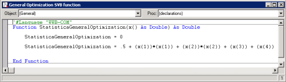 SVB file. Click this button to load a Statistica Visual Basic file in which you have defined the function you want to optimize. The SVB file must conform to the Visual Basic language format and must bear the signature name StatisticaGeneralOptimization.