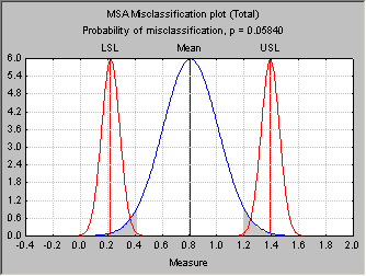 The two normal curves over the Lower specification limit and the Upper specification limit (LSL and USL respectively) represent the measurement variability (combined R&R) around these limits. The grey area indicates the reasonable risk that an item will be erroneously misclassified as acceptable (inside the USL-LSL range), when in fact it is not, i.e., when the item actually came from a distribution centered over the respective limit (LSL, USL), and specifically, falls within the area defined by ±3 time sigma (measurement variability) around the respective limit. That probability is reported at the top of the chart.