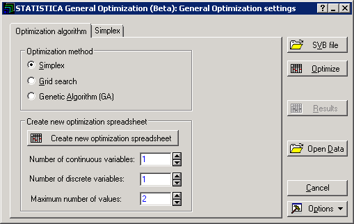 - Click the SVB file button to locate and load the GeneralOptimizationSetting.svb file (located in the Statistica Examples > Macros > Analysis Examples folder). If the parsing of the SVB file and setting spreadsheet is successful, you are ready to start the optimization process. Before that, you can review the settings and change the value of the fields according to your optimization preferences.
