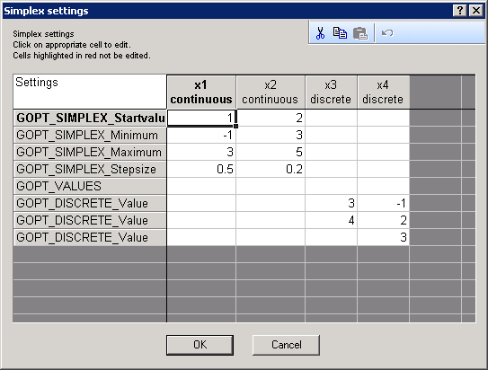 Note: If any changes are made in the spreadsheet, they are displayed in the data grid area on the Simplex tab. Similarly, you can modify the settings for the Grid search and Genetic Algorithm by selecting the appropriate algorithm option on the Optimization algorithm tab.