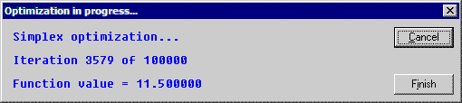 Optimize button. This initiates the optimization algorithm. While computation is in progress, you can see a progress bar displaying information about the optimization process such as current function value and iteration number.