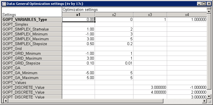 Open the GeneralOptimizationSettings.sta data file. Should you want to create your own spreadsheet, it must contain all the information necessary to the General Optimization analysis, such variable types (continuous or discrete); minimum, maximum, and starting values for the continuous variables; and number of unique values for the discrete variables.