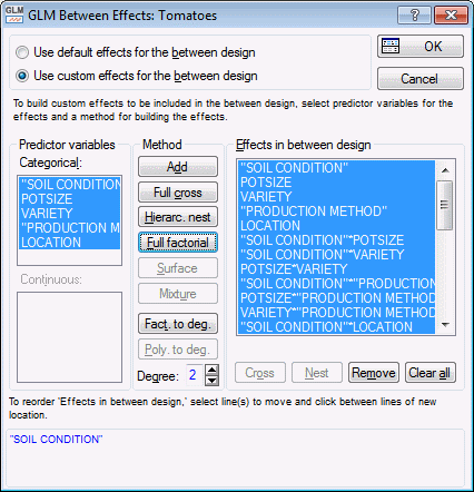 Select the Use custom effects for the between design option button. In the Predictor variables Categorical box, select all the variables. Then, click the Full factorial button.