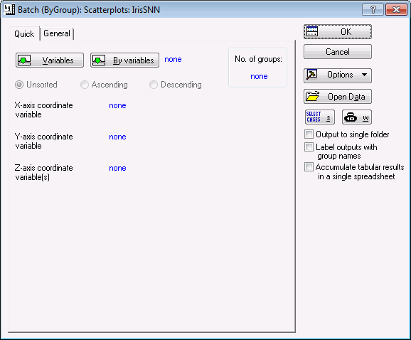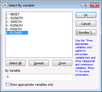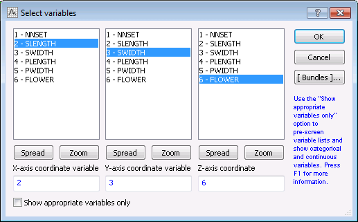 Just as in any Statistica analysis, we need to select variables before beginning any calculations. On the Quick tab of the Batch (ByGroup): Scatterplots dialog box, click the Variables button to display a three-column variable selection dialog box. Clear the Show appropriate variables only check box if it is selected in order to display all variables in the data set in the variables lists. Select SLENGTH, SWIDTH, and FLOWER as the x, y, and z-axes, respectively.