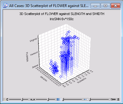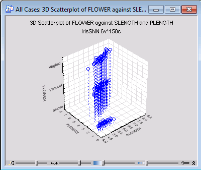 Repeat the above steps for various combinations of SLENGTH, SWIDTH, PLENGTH, and PWIDTH, as the x and y axes, with FLOWER fixed as the z-axis.