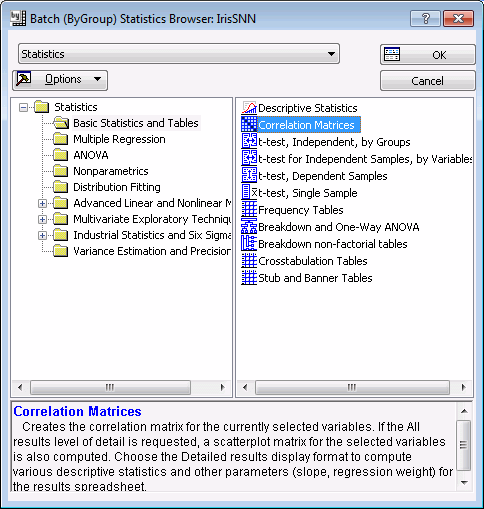 In the left pane, select the Basic Statistics and Tables folder to display its contents in the right pane. Select Correlation Matrices in the right pane.