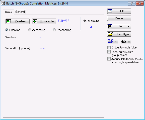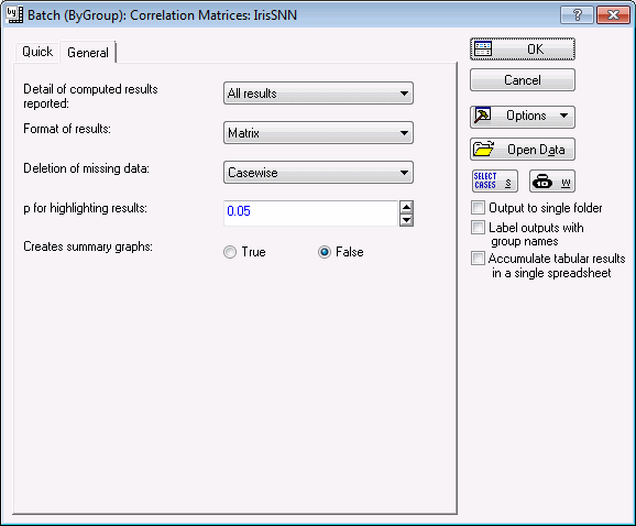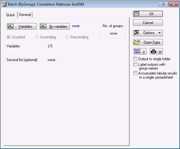 Click OK to display the Batch (ByGroup): Correlation Matrices dialog box.