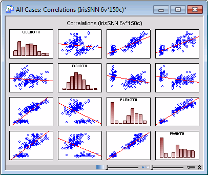 Click the OK button in the Batch (ByGroup): Correlation Matrices dialog box to run the analysis. An examination of the correlation between PWIDTH and the rest of the predictor variables will show considerable improvement this time, thus providing us with sufficient reason to believe that PWIDTH can be sufficiently modeled using SLENGTH, SWIDTH, and PLENGTH. A visual inspection of the scatterplot graphs confirms this finding.