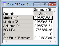 Examine the Summary Statistics spreadsheet, and note that the value of R2 is 0.9380. The fact that R2 is close to unity indicates a good regression model, i.e., a regression that can predict the dependent variable with good accuracy from the predictor variables. Note that further examination of the regression model is possible using other properties of the model, including p-value, standard error, and estimates of model coefficients.