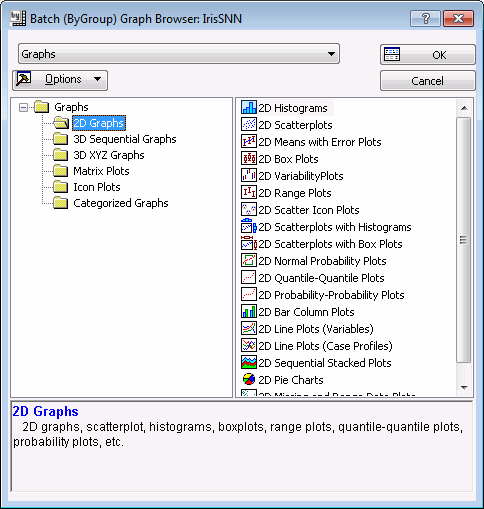 In the Batch (ByGroup) Graph Browser, click the 3D XYZ Graphs folder in the left pane to display its contents in the right pane. Select Scatterplots in the right pane, and click the OK button to display the Batch (ByGroup): Scatterplots dialog box.