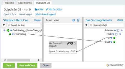 Some of the basic integration patterns work out of the box. For instance, after you deploy a Boomi Atom on the on-prem Statistica Server, you can use the local DBMS system (or even flat file types) to stage data in and out for Statistica Server or Live Score. Boomi has integration points with Web Services that allow a Boomi integration process node to initiate a Statistica process, and vice versa.