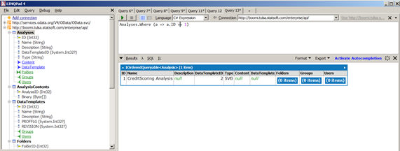 - This service exposes (at this moment a subset of) the Statistica Enterprise database – items like analyses, data templates, folders, users, and groups. Of interest to the Boomi Edge Scoring use case are: