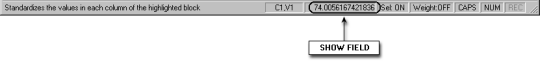 The Show Field of the status bar displays the value of the currently highlighted cell at a higher precision than will fit in the respective columns of the spreadsheet. The width of the Show Field can be adjusted (toggled) by clicking on it.