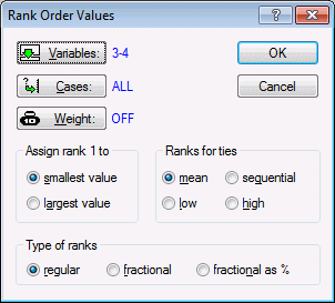 Select the Data tab. In the Transformations group, click Rank to display the Rank Order Values dialog box.