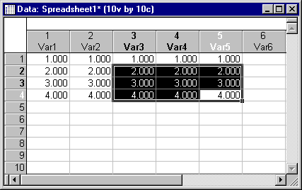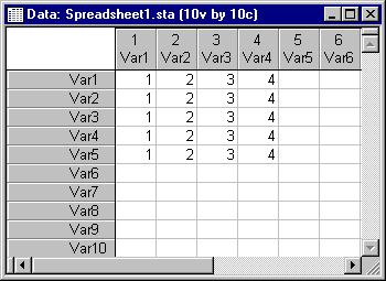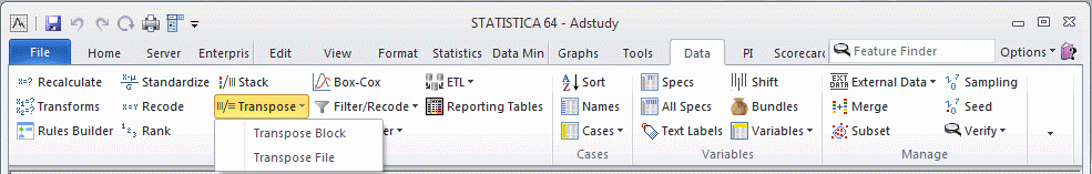 Data file transposing restructures the entire file. For example, transposing the data file previously shown (before the block was transposed), changes the number of cases and variables in the data file: