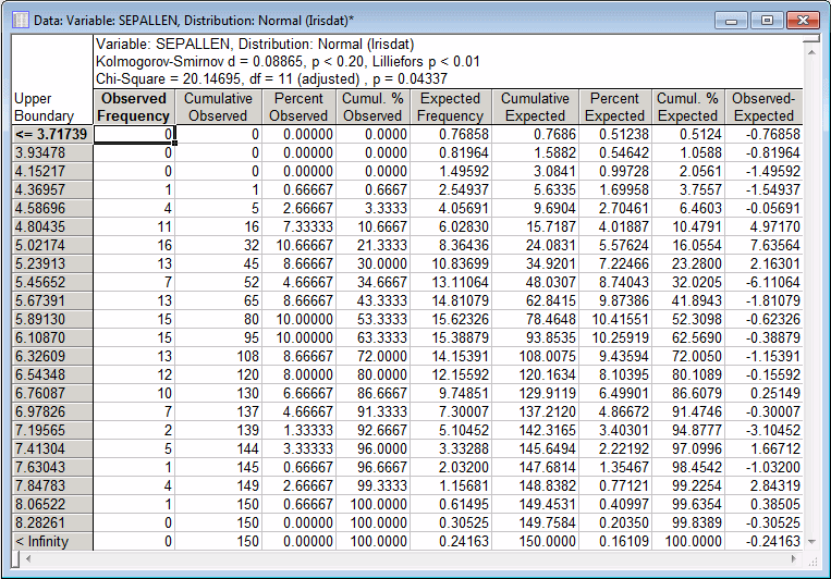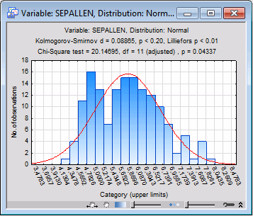 Often, the Chi-square value is greatly affected by the way in which the distribution is "sliced up," that is, by the number of categories and minimum and maximum values that we choose. For example, if we slice the distribution for Sepallen into 23 pieces (enter 23 in the Number of categories box on the Parameters tab), rather than the default 10 categories, the resulting Chi-square value is only marginally significant at the p = .04 level.