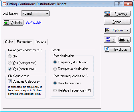 Next, select the Options tab. In the Kolmogorov-Smirnov test group box, select the Yes (continuous) option button. Accept all of the other default selections in this dialog box, and click the Summary button to compute the frequency distribution.