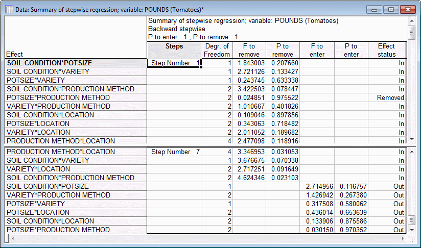 This example illustrates model building in GRM using backward stepwise regression. The data for this example is available in the Tomatoes.sta data file. The design is a 5-way mixed-level fractional-factorial design with both 2- and 3-level categorical predictor variables. All main and 2-way interaction effects are estimable for this design (see the GLM module Advanced Example: Type V Sums of Squares). A description of the variables in the data set can be found in the Experimental Design module example Designing and Analyzing a 23, 32 Experiment. Refer also to the Mixed 2 and 3 Level Designs topic for additional details concerning these types of designs.