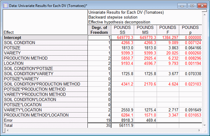 Select the Summary tab. Click the Univar. results button to produce the Univariate Tests of Significance for Pounds spreadsheet, which shows the summary ANOVA table for the final model.