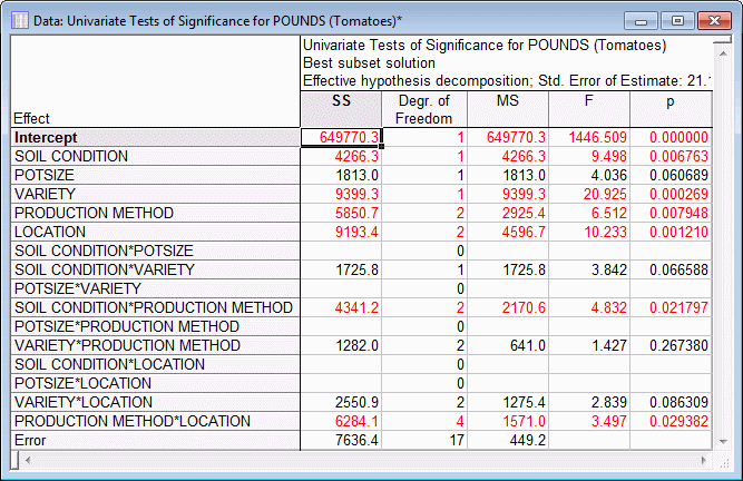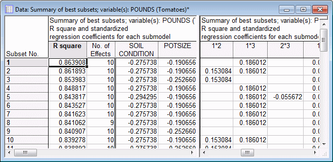 Using the default R squared option button as the best-subset criterion, the best-subset will always be a submodel of the largest subset size that was searched. For this example, there were 10 effects in the "best" subset, but note in the ANOVA table for the final model that the Variety*Production Method 2-way interaction effect did not approach significance, p > .25. (Click the All effects button to view the Univariate Tests of Significance for Pounds spreadsheet.)