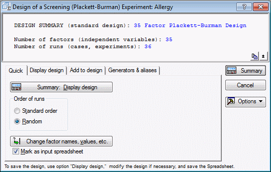 For this study, we want to screen 35 factors, which we can accomplish in 36 runs by choosing the 35/36 Plackett-Burman design. Click on that design now, and then click OK (or double-click on the design) to display the Design of a Screening (Plackett-Burman) Experiment dialog box.